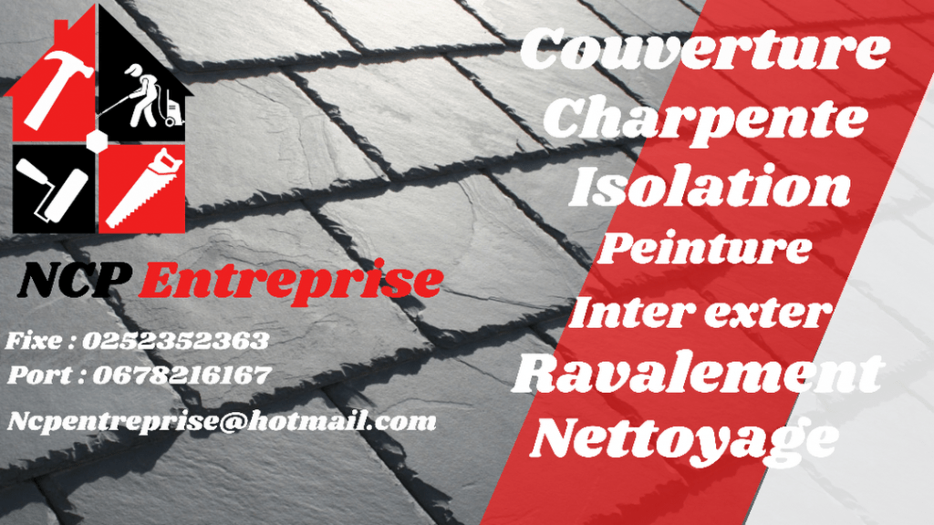 NCP Entreprise est spécialisé dans le domaine de la couverture et de la peinture basé a saint-mathurin dans le Maine et Loire, nous offrons nos services pour votre toiture neuve ou en rénovation : Tuiles, ardoises, fibro, shingle, bac acier, bardages, étanchéité terrasse. Peinture intérieur et extérieur : boiseries, murs, ferronnerie, pignons, marches, tuiles, plafonds, ravalement projeter. Isolation thermique et phonique : Laine de verre, laine de roche, laine végétale. Nettoyage à haute et basse pression des toitures, murs, murets, dallages, gouttières. Zinguerie. Gouttière en zinc, pvc et alu. Vérification de Charpente. Vérification devis et déplacement gratuit.